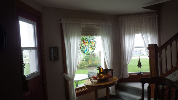 This is an addition on the left side of the house. It has the original stained glass window pictured in the 1946 peak of the front of the house installed high on the back of the addition.