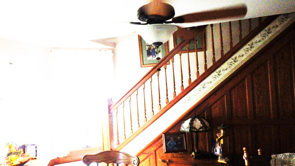 This lightened picture shows the original woodwork on the side of the stairs.
